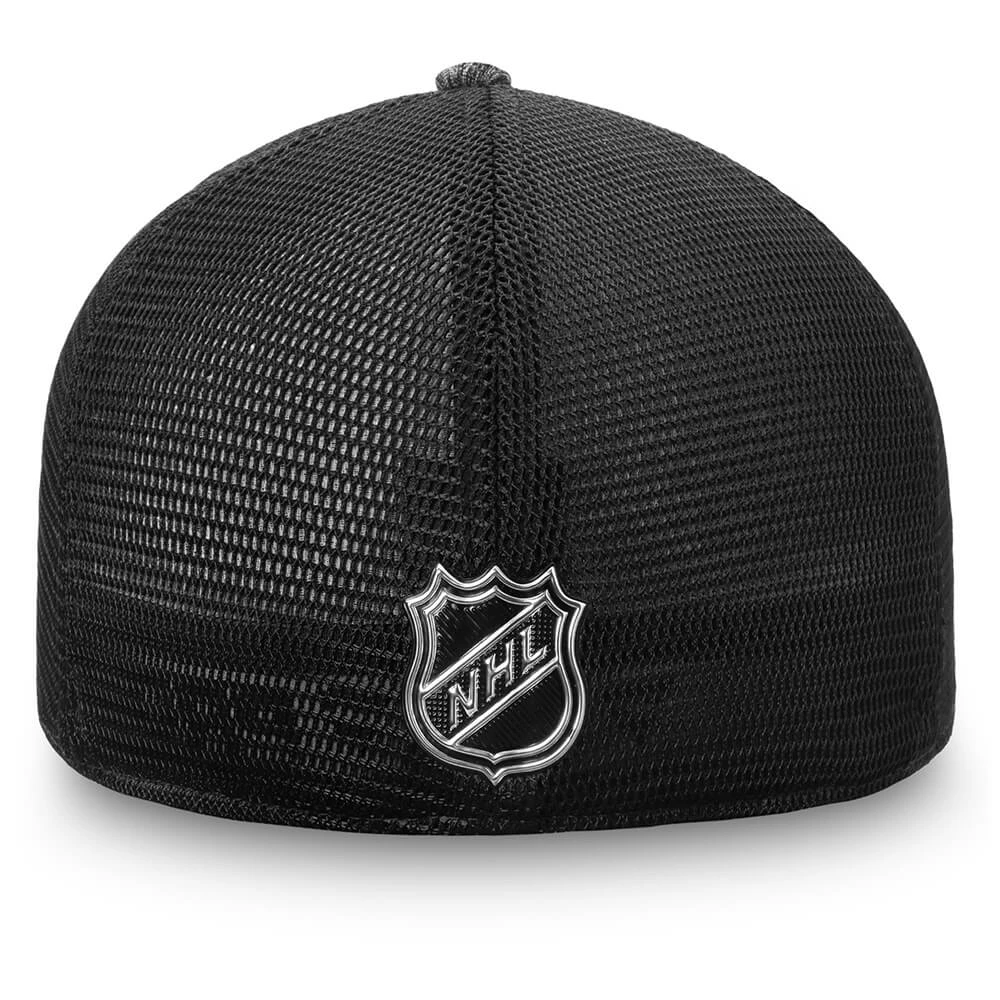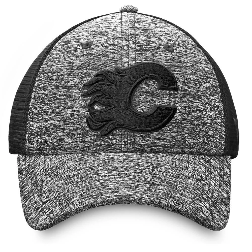 Show your Calgary Flames team pride while rocking this stretch mesh hat featuring a unique Black Ice design with the hat and logo being black and grey. Embossed NHL logo shield on the back.