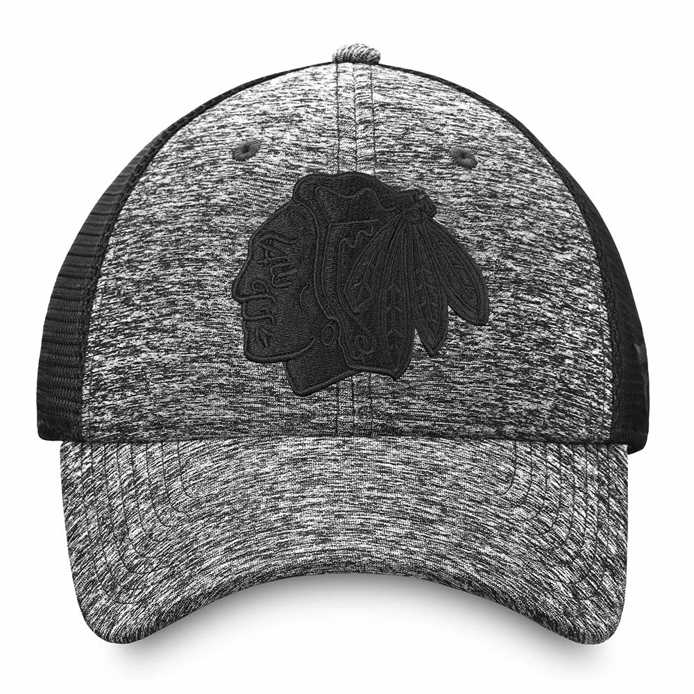 Show your Chicago Blackhawks team pride while rocking this stretch mesh hat featuring a unique Black Ice design with the hat and logo being black and grey. Embossed NHL logo shield on the back.