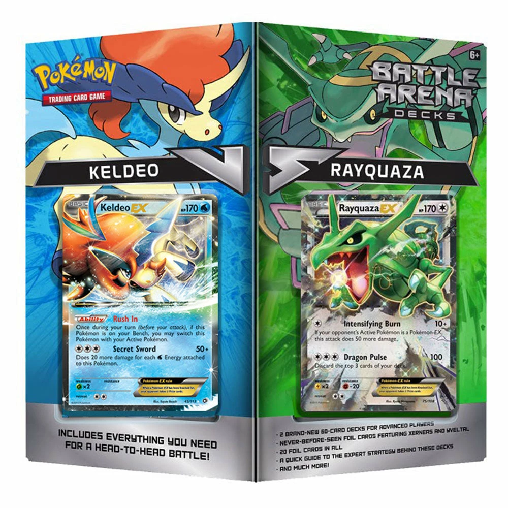 Rayquaza and Keldeo go head to head in the new Pokémon TCG Battle Arena Decks! These two 60-card decks are ready to play right away, with powerful cards and winning strategies worthy of an ace Trainer! Each deck is led by an exceptional Pokémon-EX and includes 10 foil cards. Let the battle begin!